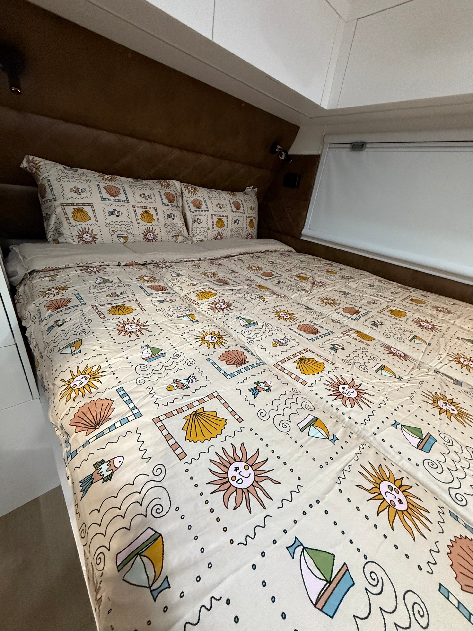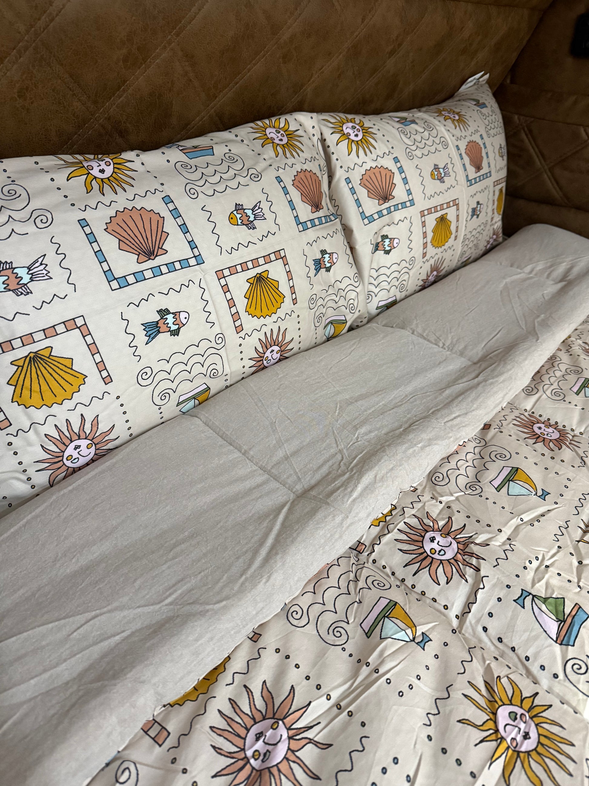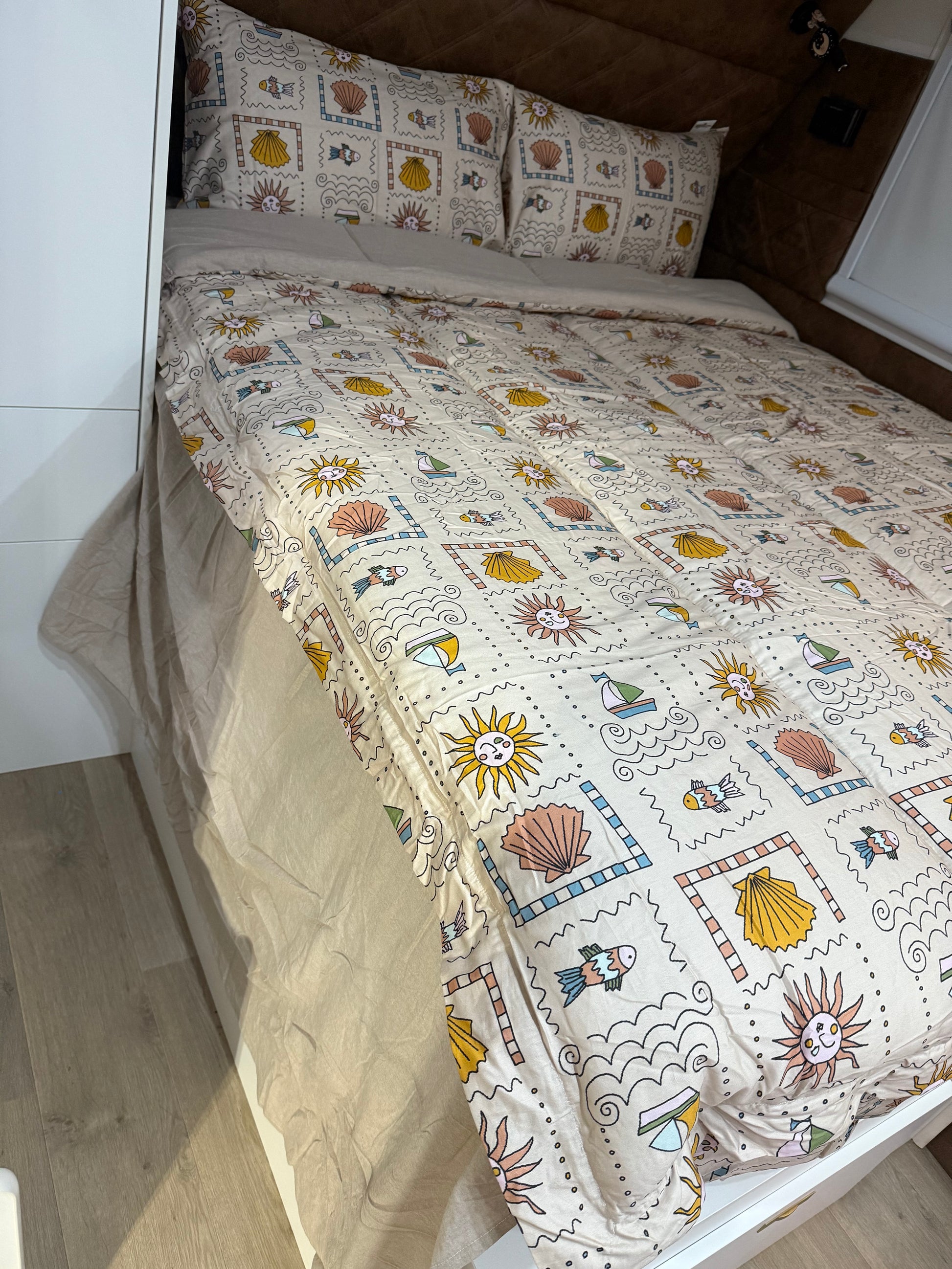 Our Aurelia bedding is a seaside daydream come to life — featuring cheerful suns, sweet little sailboats, seashells, and quirky fish dancing across soft, sandy-toned fabric. With hand-drawn charm and a splash of retro fun, it’s the perfect pick for beach-loving kids and caravan getaways. Whether you’re setting sail or snuggling in, Aurelia brings the sunny vibes all year round.