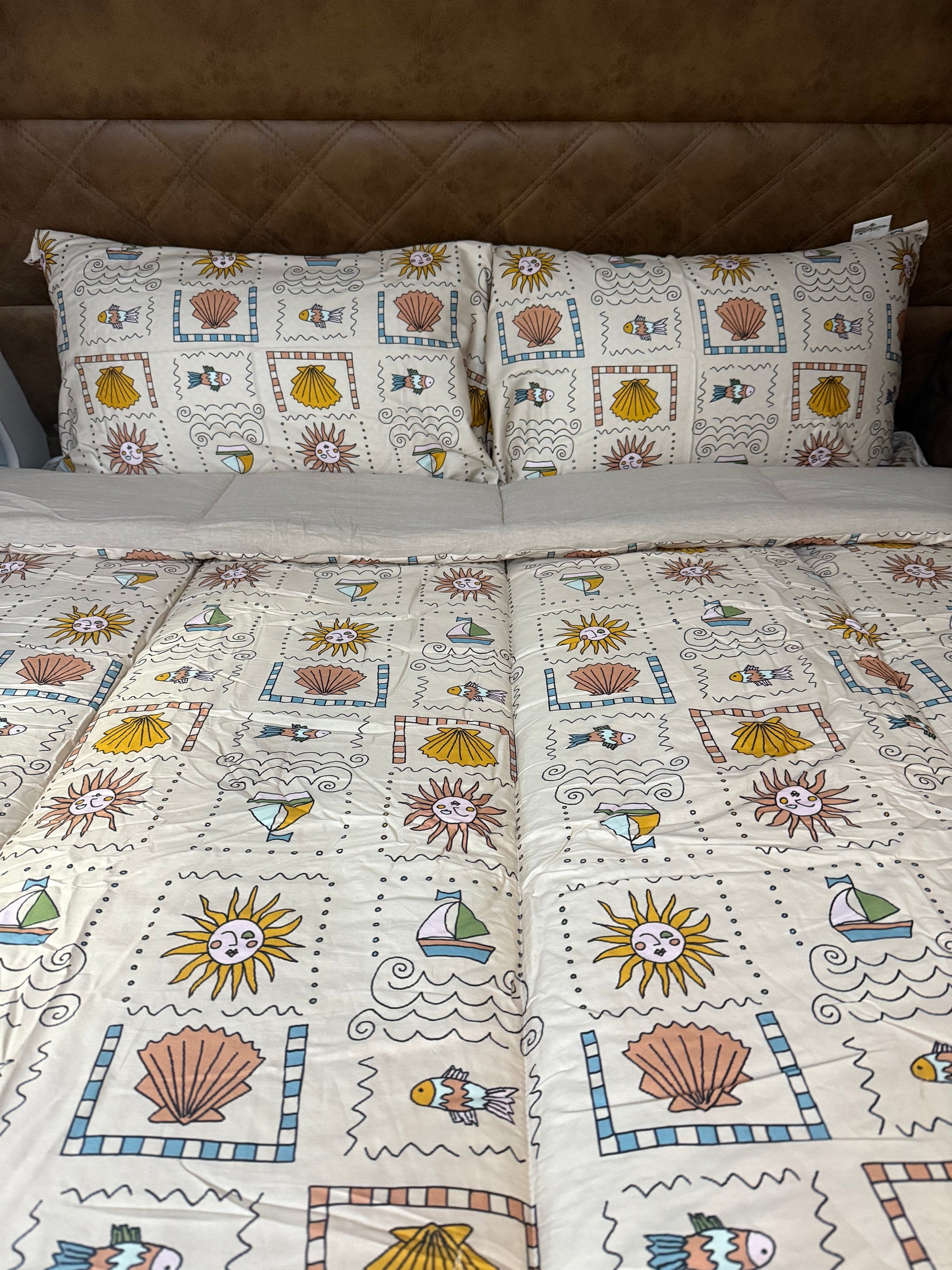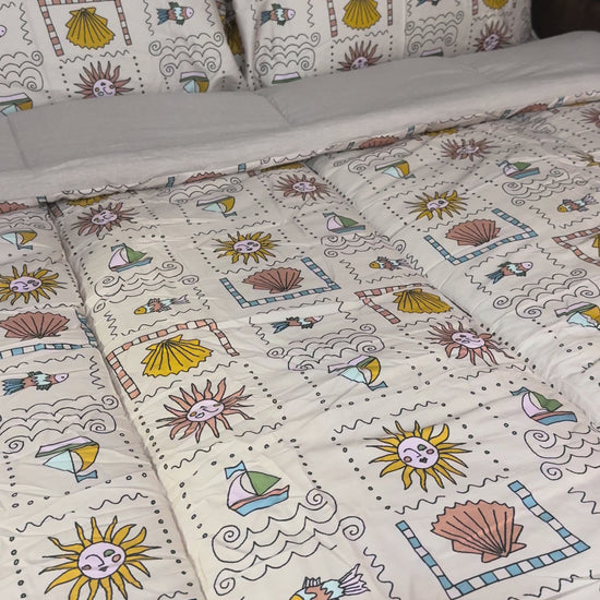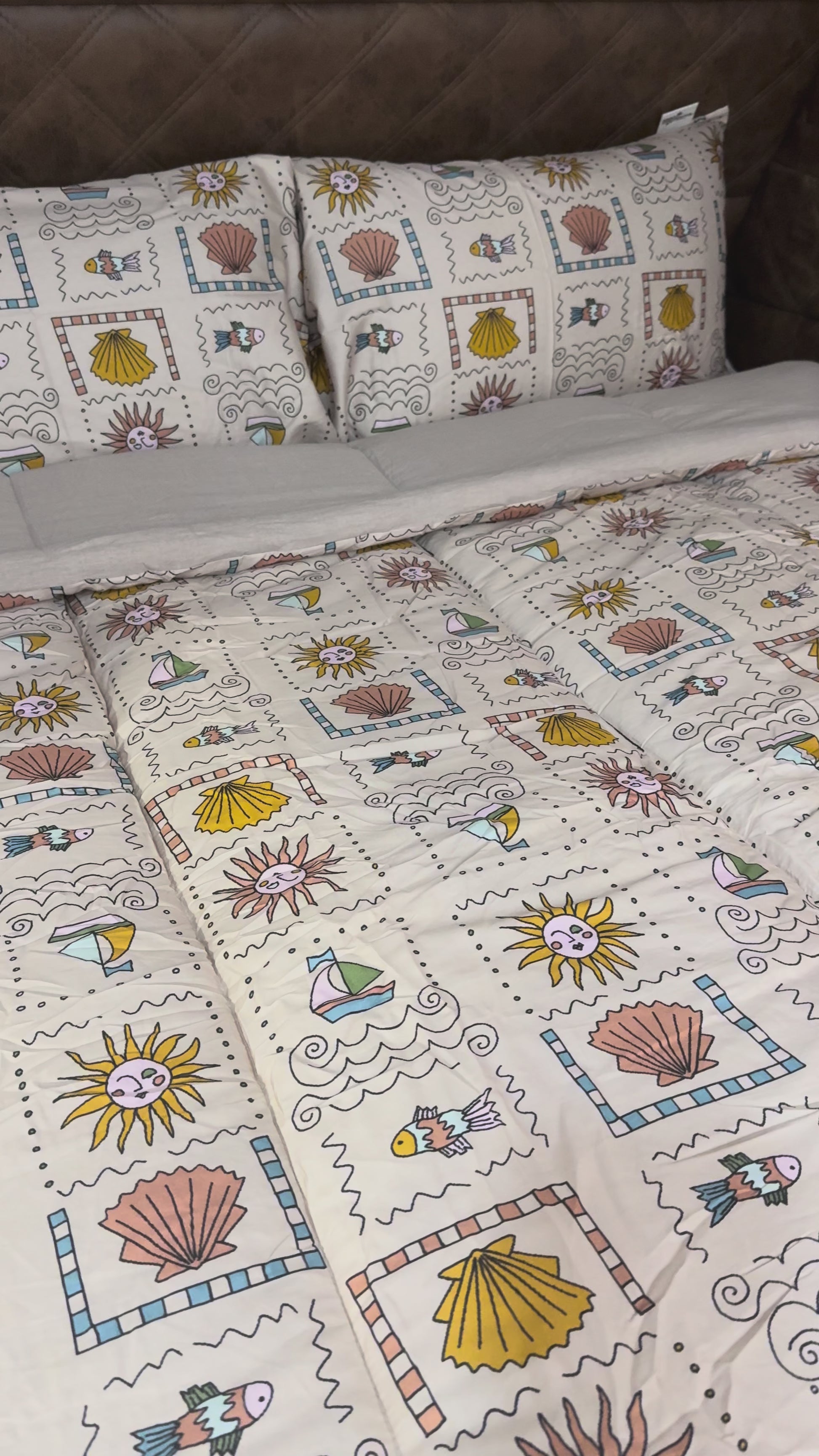 Our Aurelia bedding is a seaside daydream come to life — featuring cheerful suns, sweet little sailboats, seashells, and quirky fish dancing across soft, sandy-toned fabric. With hand-drawn charm and a splash of retro fun, it’s the perfect pick for beach-loving kids and caravan getaways. Whether you’re setting sail or snuggling in, Aurelia brings the sunny vibes all year round.