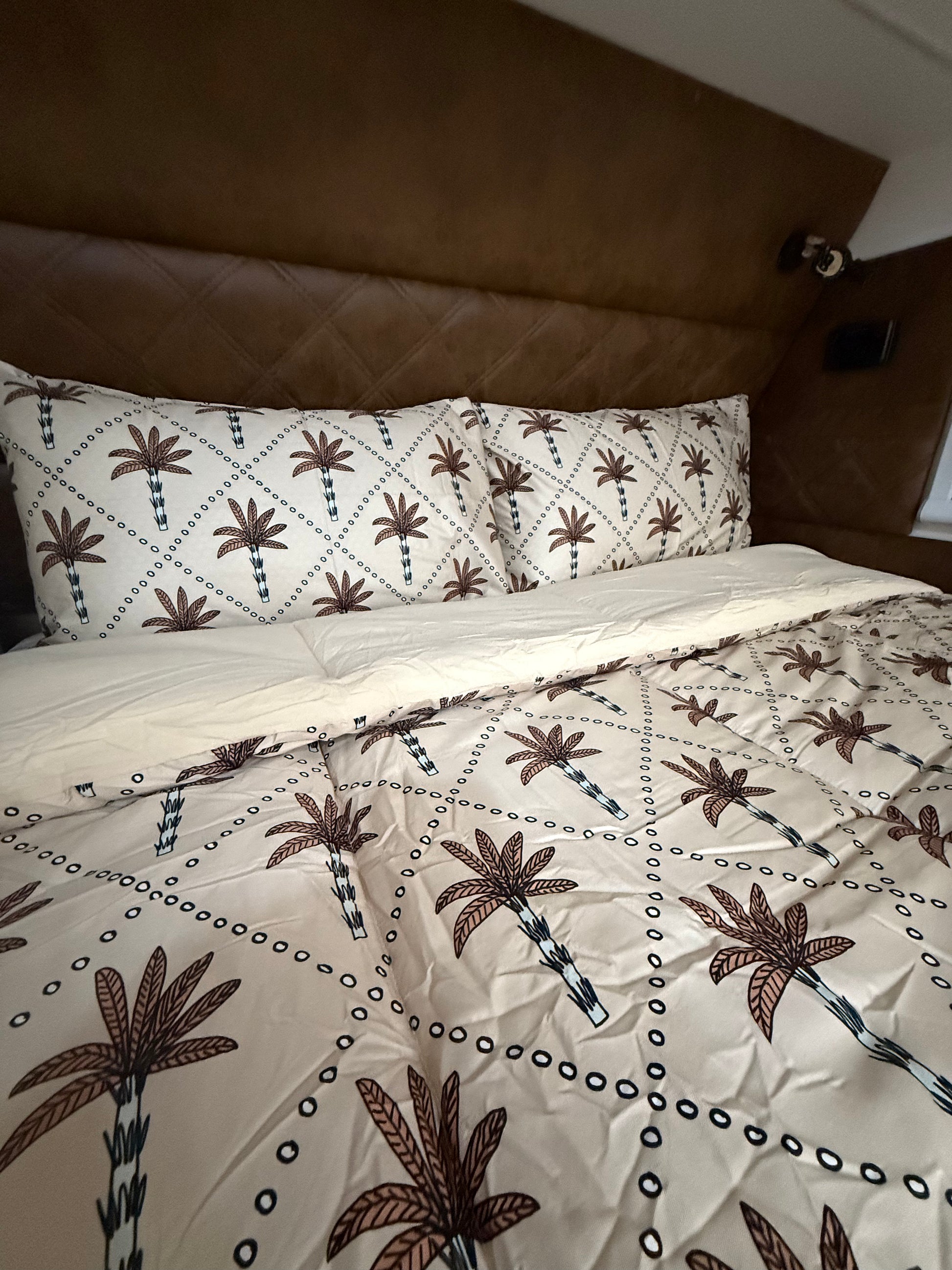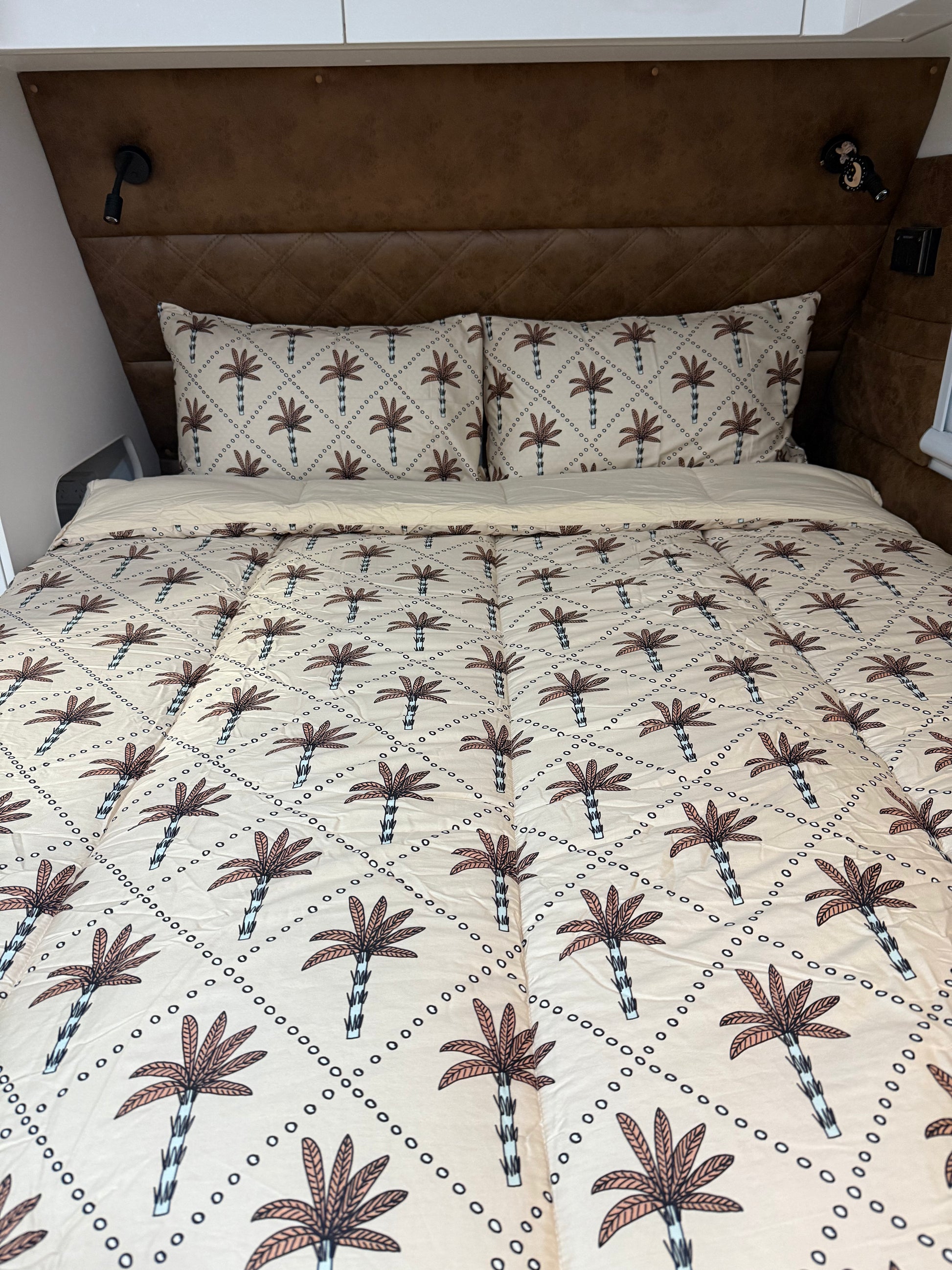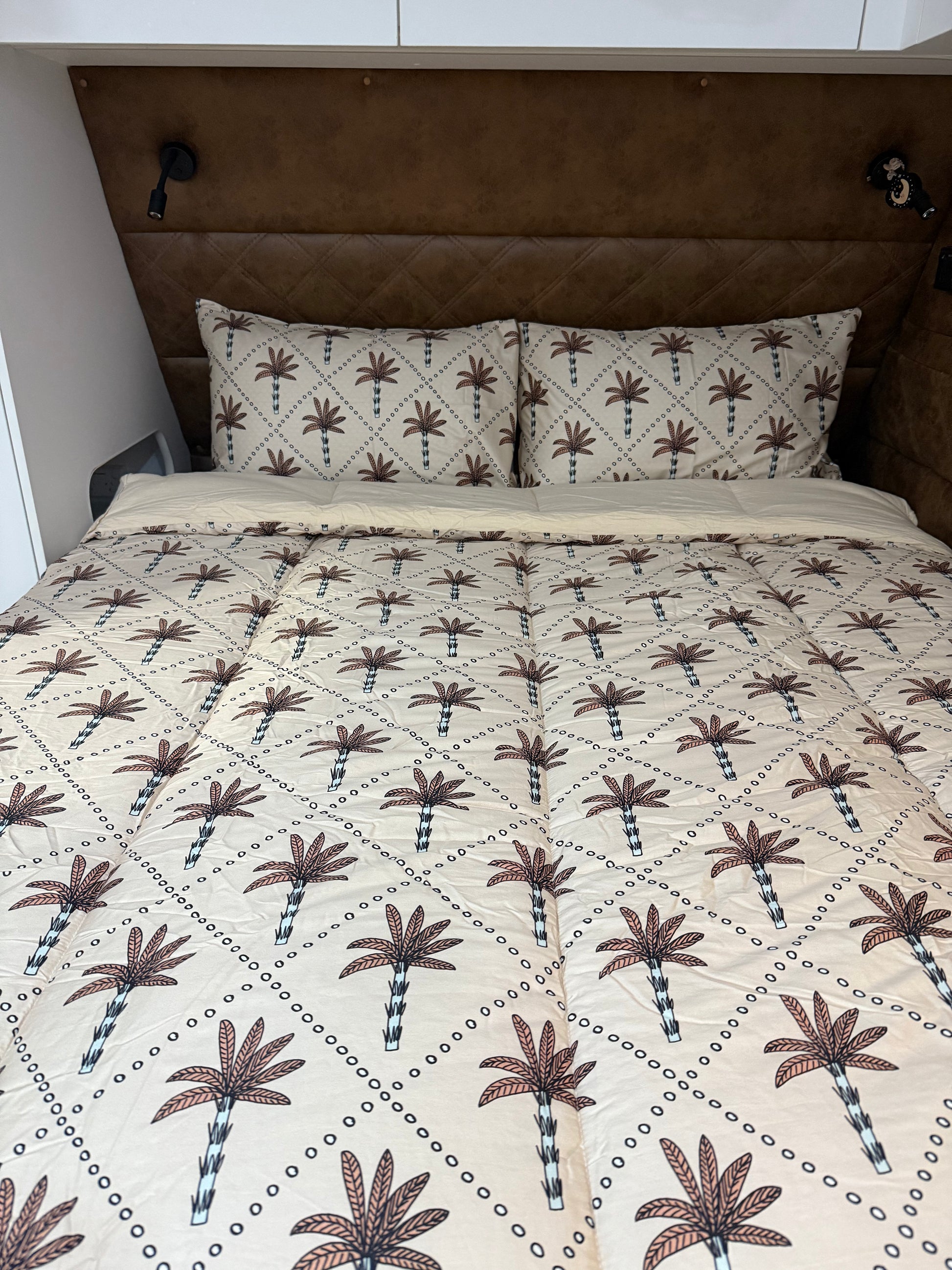 This playful print features hand-drawn palm trees dancing across a soft, sandy backdrop, giving your caravan a little slice of paradise. Perfect for mini adventurers who dream of island getaways, Lennox brings sunshine and style to every sleep. It’s comfy, cool, and oh-so-easy to make — just tuck, zip and let the good times roll!