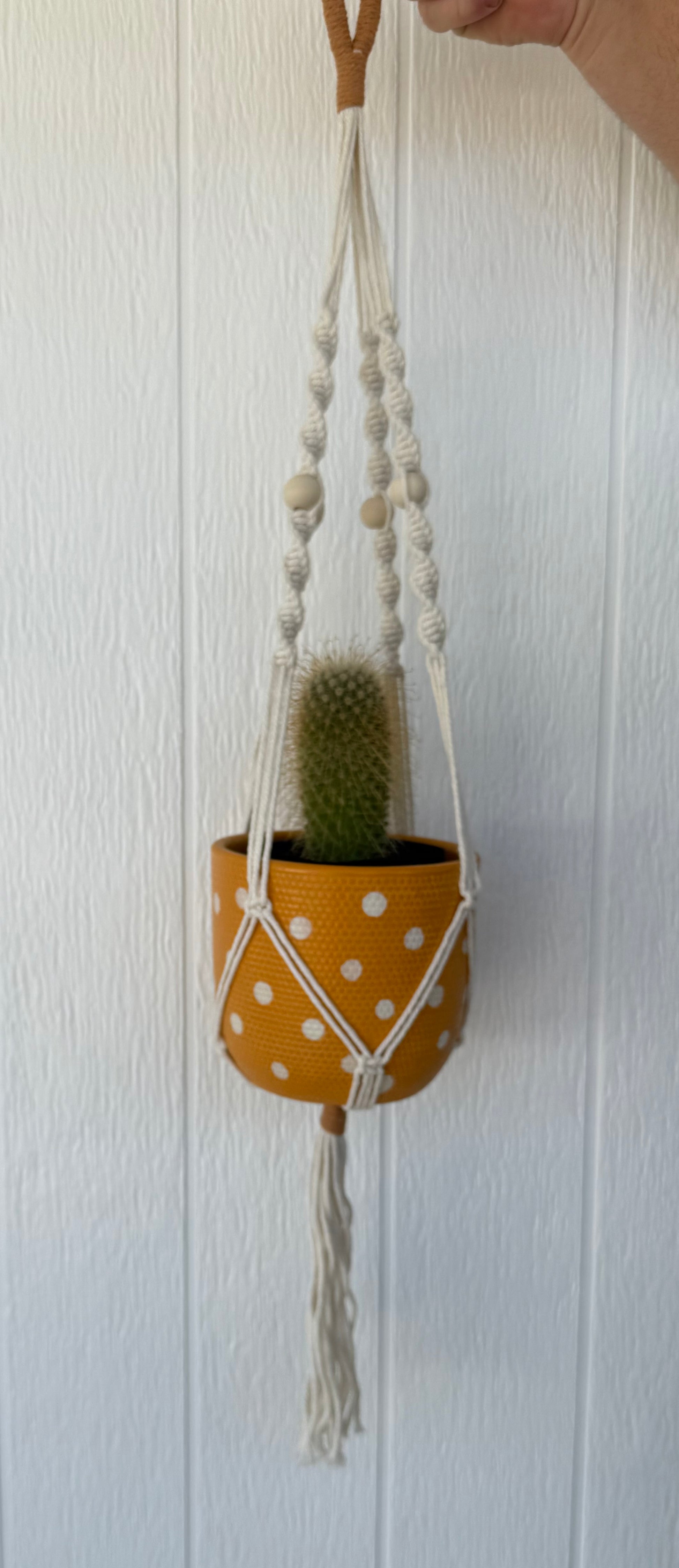Bring instant charm to any corner with this handmade macramé plant hanger — a dreamy mix of natural cotton rope, warm earthy tones, and smooth wooden beads. Whether it’s holding your favourite cactus, trailing greenery, or a splash of colour, this hanger turns any pot into a statement piece.